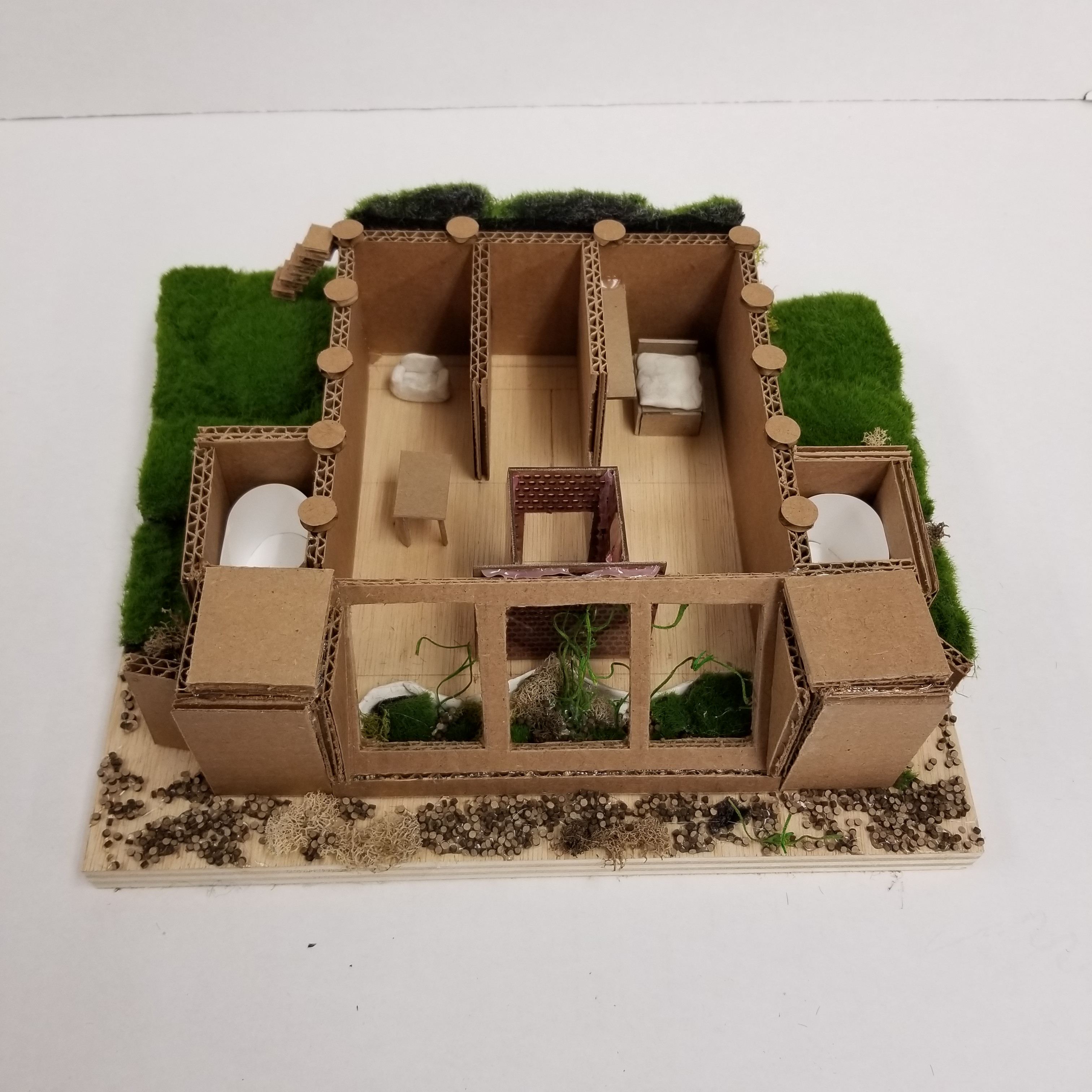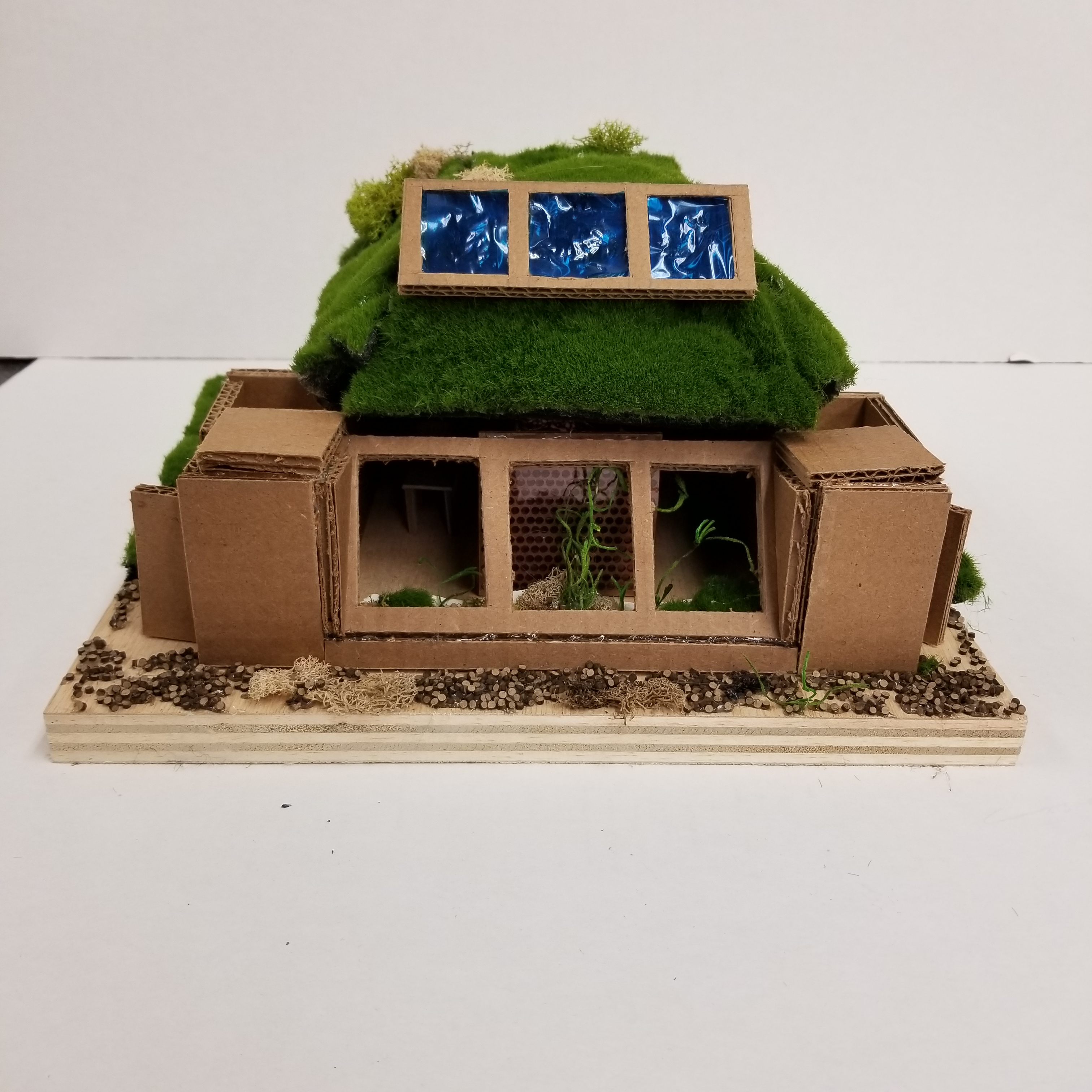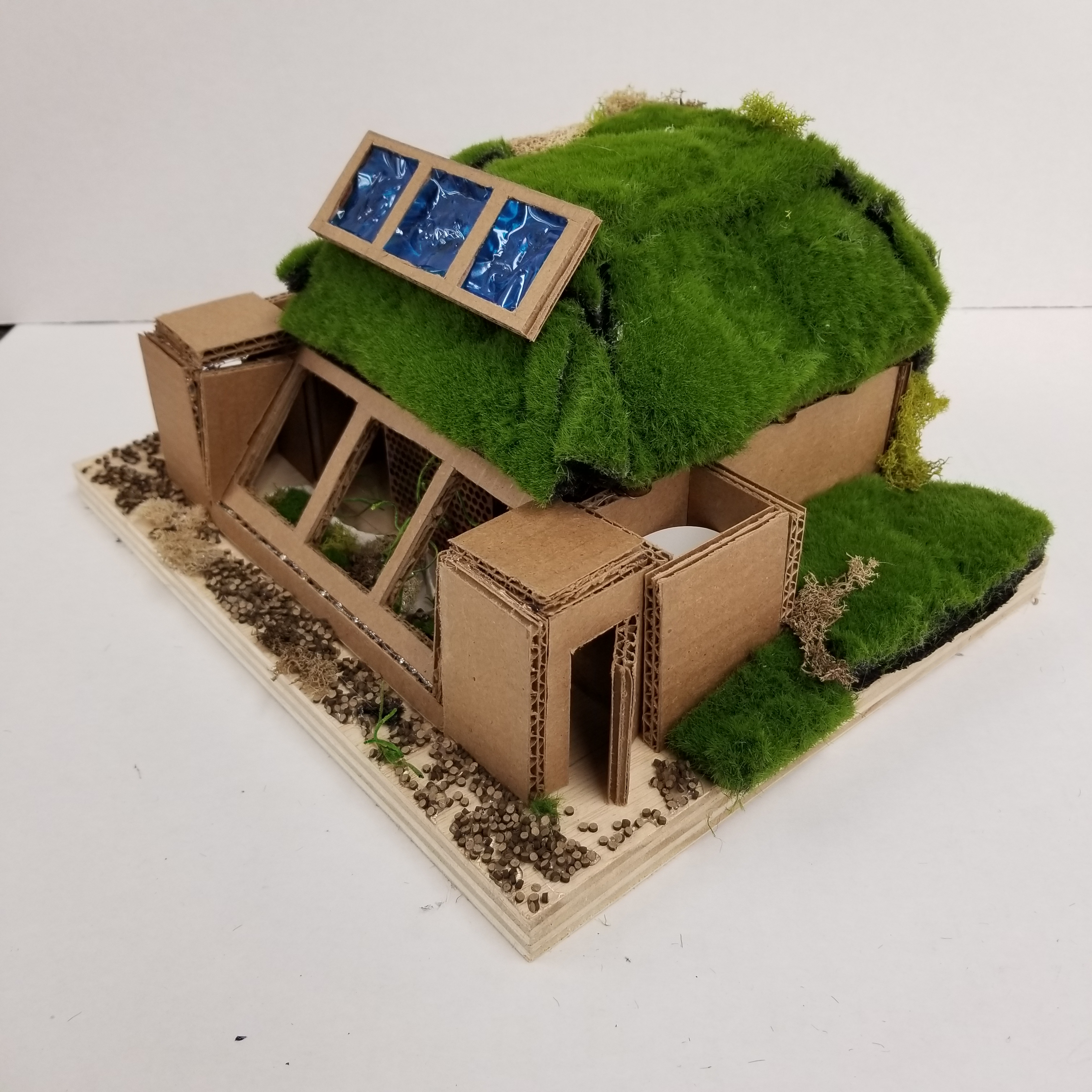 This project serves as a model for a fully self-sustaining home, complete with heating and cooling, energy generation, plumbing, water capture and purification systems, and a greenhouse.