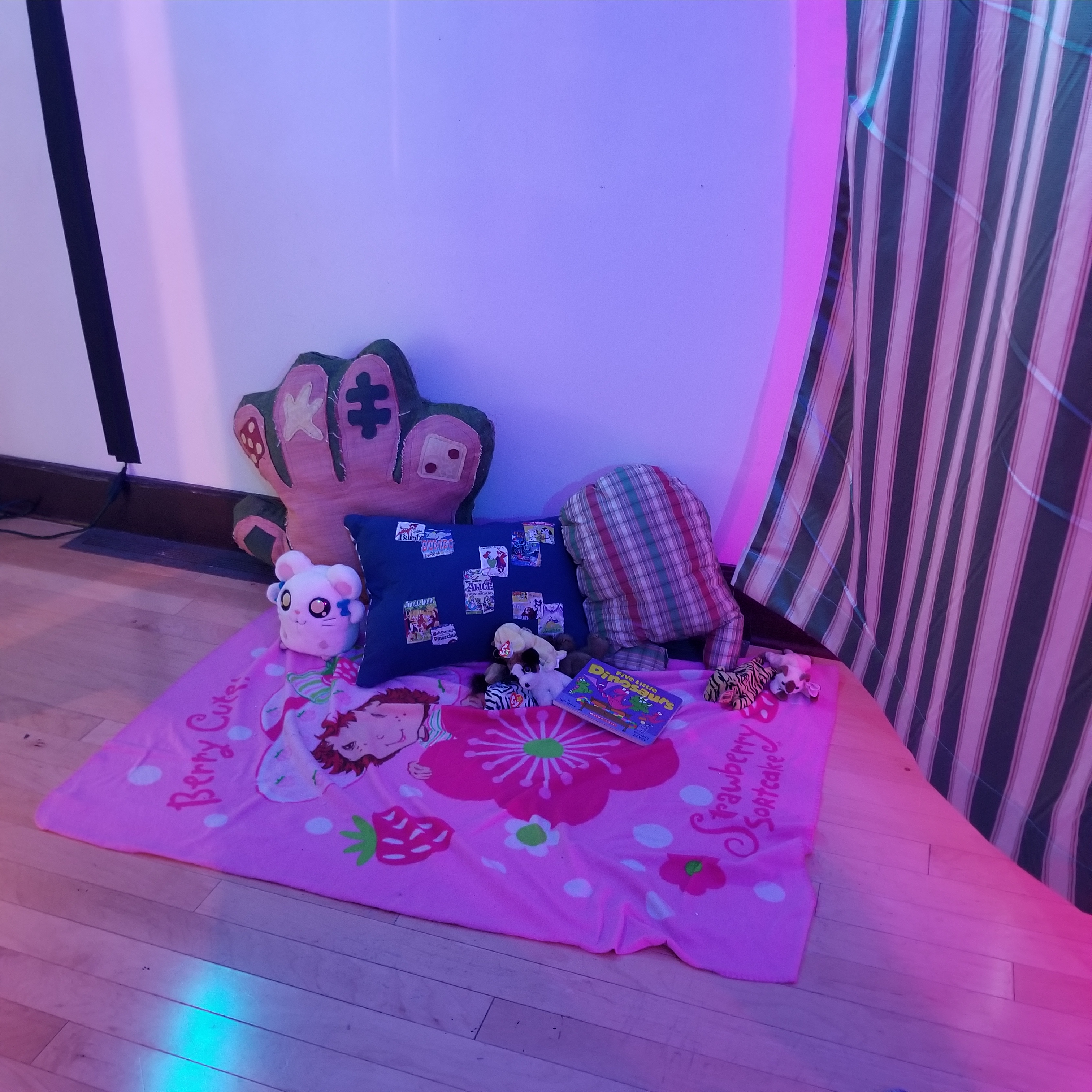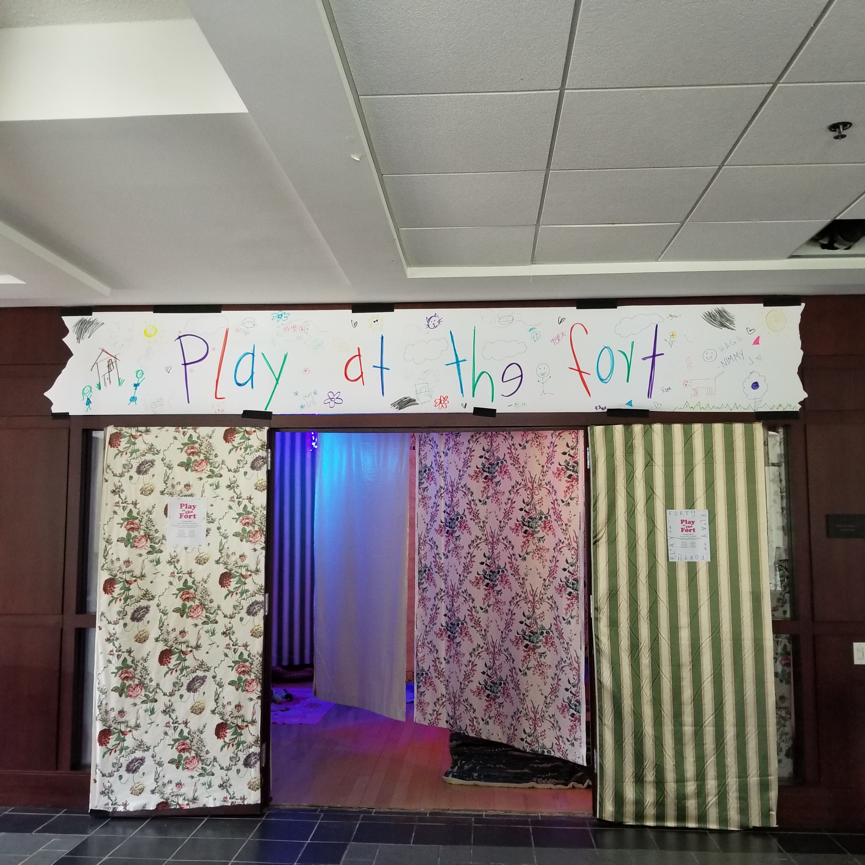 When you were a child your mind was teeming with wonder and curiosity. The reason for this is because the mind was growing, developing, and experiencing the world around it. in the reading “Space and Place” by Yi Fu Tuan, chapter 3 is all about the development of a child and how they interpret space and place around them . Place represents security, while space represents freedom. For a child they do not know how to differentiate between the two until they explore and experience these complex concepts on their own . The more a child explores, the more they will be able grasp the way of the world. This installation “Play at the Fort” gives the chance to transport back and experience this childhood nostalgia. The students of Installation Art 334 jumped into the mind of their younger selves in order to take an unfamiliar space and transform it into a place of familiarity to let wonders and curiosities flood back into the minds of the viewers to once again feel like a child and experience the nostalgia.