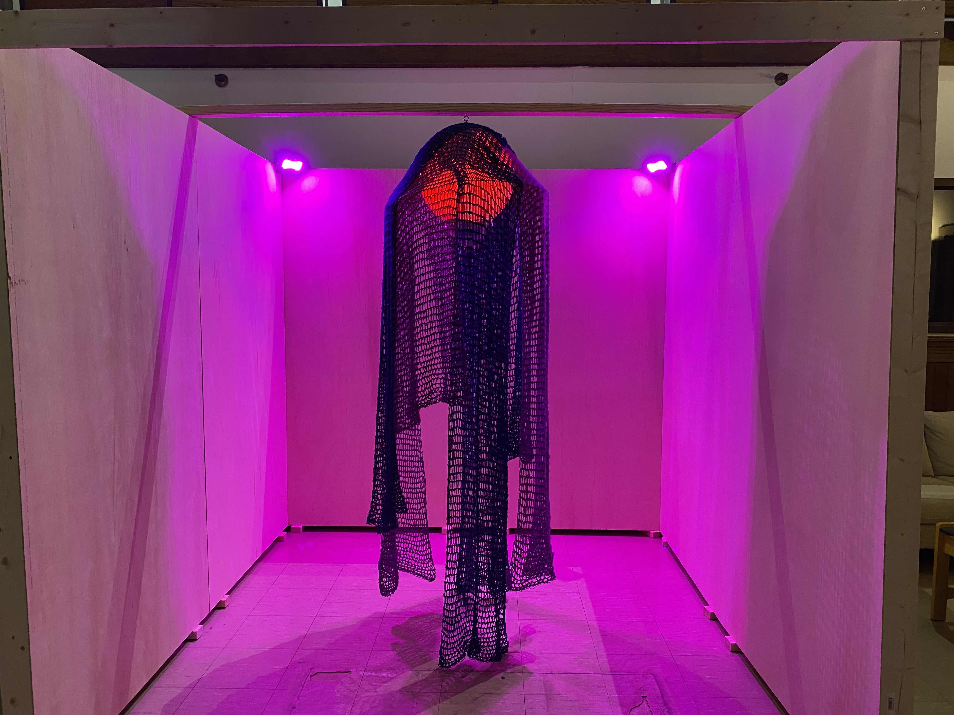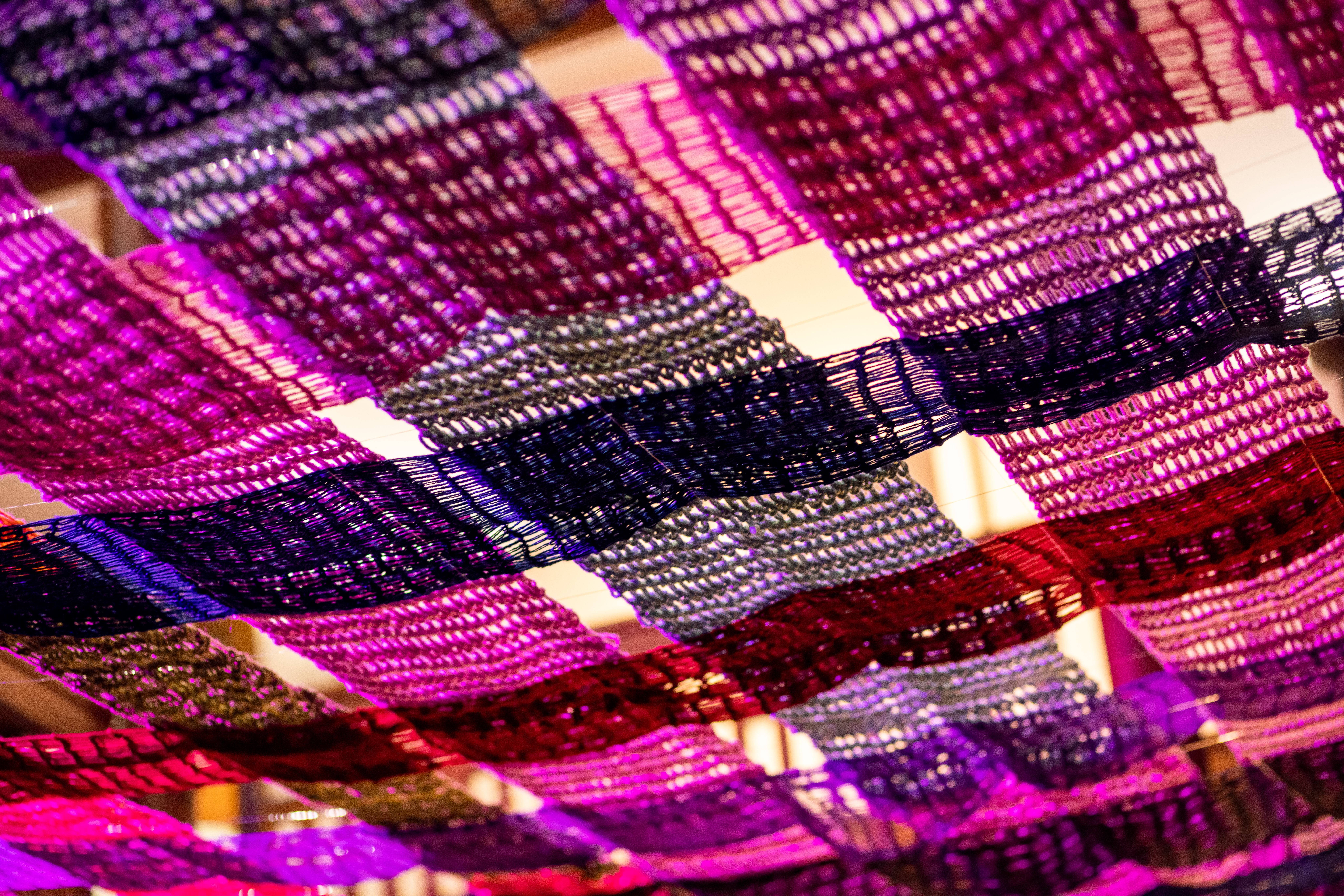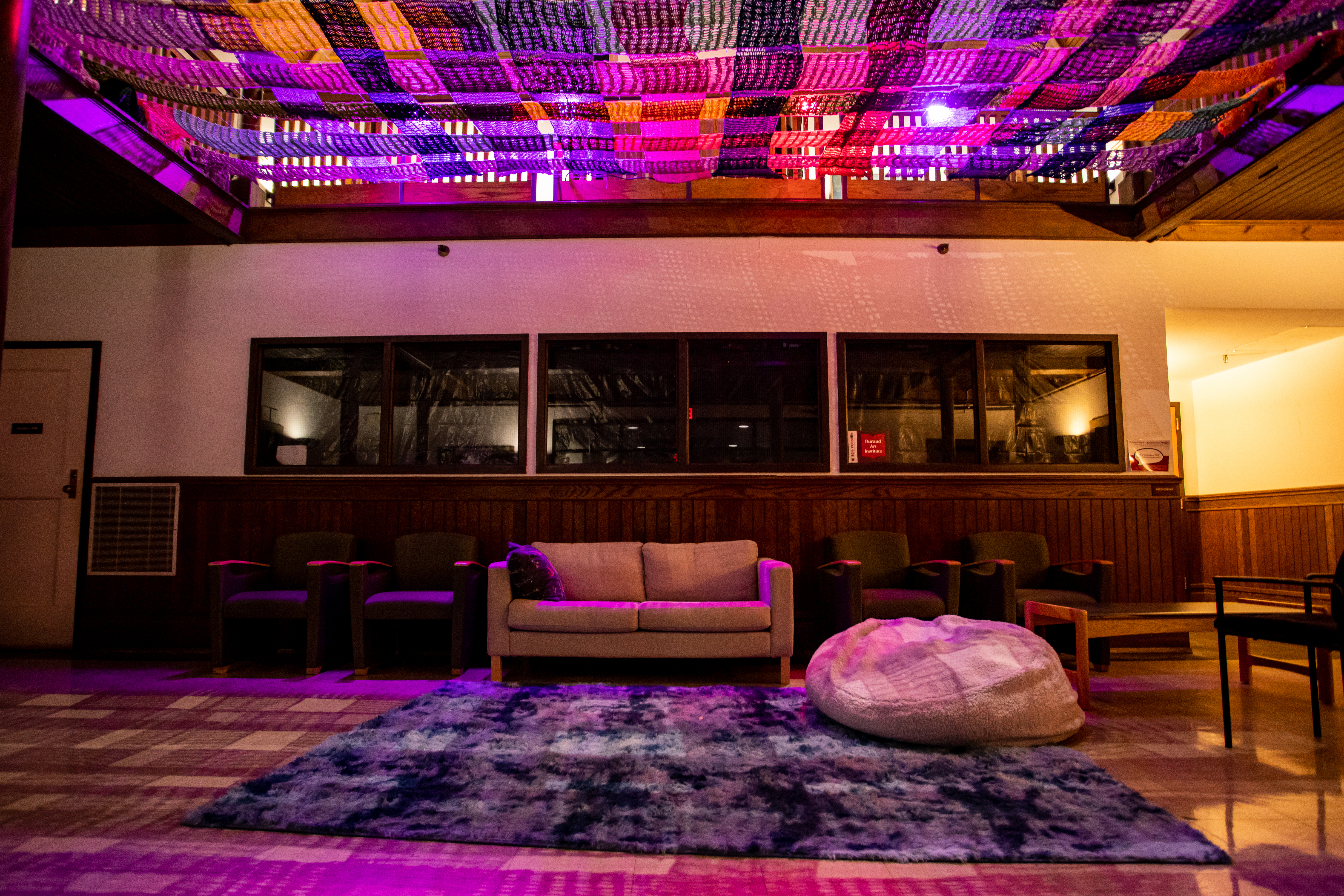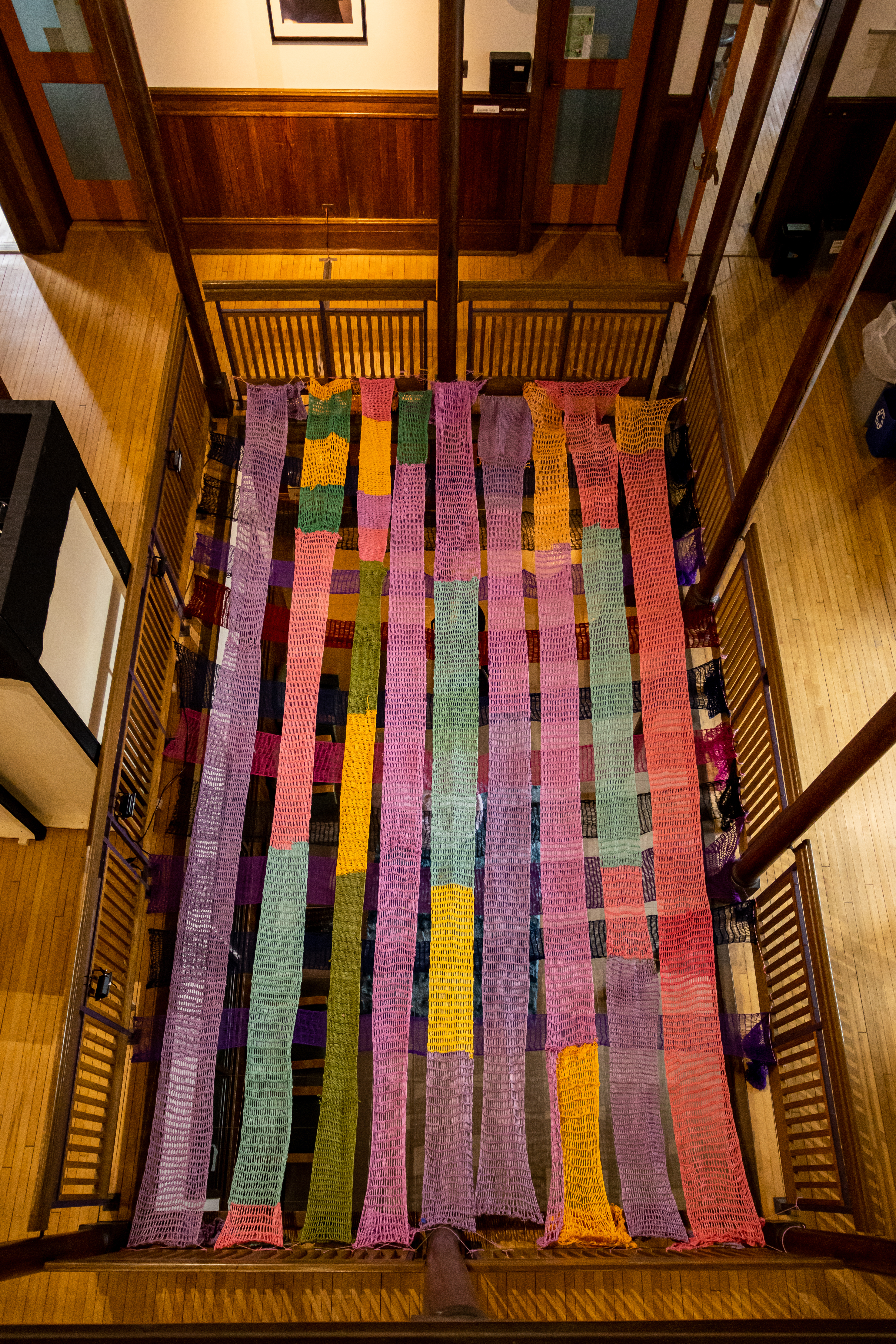 Using handmade blankets of crochet stretching overhead, I explore themes of comfort, love, and community. As a college student, I’m at a critical and stressful point in my life where I am simultaneously grappling with my identity while having the pressure to make crucial decisions regarding my post-graduate path. Amidst this turmoil, I sought out a project to act as a source of refuge, where the act of crochet became my daily meditation, and the cozy appeal of these blankets can instill a sense of comfort in its viewers. Inspired by the gift-giving culture of the crochet community, I began treating this installation as a gift from maker to viewer. Handmade gifts involve putting time and effort into an object without expecting anything in return. That’s a beautiful expression of love. Combining these ideas with the visual impact of yarnbombing, a movement that covers public spaces in crochet art, I sought to gift other students a space for rest and comfort.